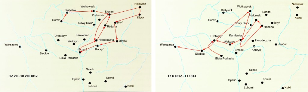 Ryc. 3. Trasy przemarszu i działań Korpusu saskiego w okresie od 12 lipca a 10 sierpnia 1812 roku oraz od 17 października 1812 do 1 stycznia 1813 roku (źródło: Snopkiewicz, J. 2010. Armia saska 1763-1815, t. 2. Seria Wojownicy. Inforteditions)
