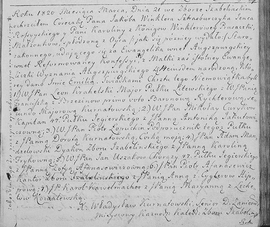 „Roku 1820 Miesiąca Marca, Dnia 21 we Zborze Izabelińskim ochrzciłem Córeczkę Pana Jakóba Winklera Sztrasburczyka Jeńca Rossyyskiego y Pani Karoliny z Königów Winklerowey Prusaczki, Małżonków, spłodzoną z Oyca (jak się później wydało) Starozakonnego, udającego się za Ewangelika wnet Augszpurgskiey wnet Reformowaney Konfessyi, z Matki zaś istotney Ewangeliczki Wyznania Augszpurgskiego13.”