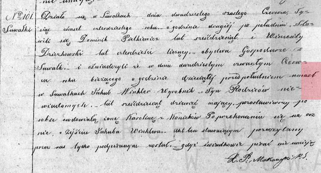 Ryc. 6. Akt zgonu Jakuba Winklera 1840 roku (źródło: Wojewódzkie Archiwum Państwowe w Suwałkach, Oddział Terenowy w Białymstoku / http://www.szukajwarchiwach.gov.pl).