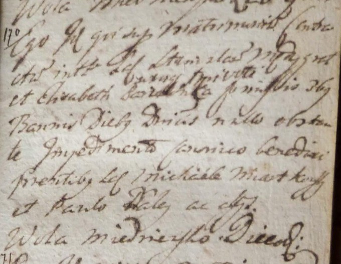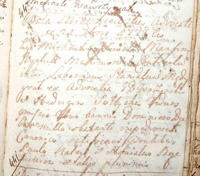 Ryc. 16. Akt ślubu z 1776 roku wdowy Elżbiety Mędygrał z Wojciechem, określonym w akcie jako advenam juvenem czyli „przybyszem, młodym mężczyzną”. Jedyną znaną z innych źródeł kobietą o tym imieniu i nazwisku jest żona „pierwszego” Stanisława Mędygrała, jednak identyfikacja tej Elżbiety z nią wydaje się mało prawdopodobna (źródło: Metryki GenBaza).