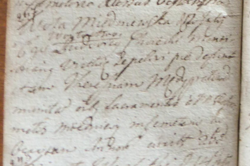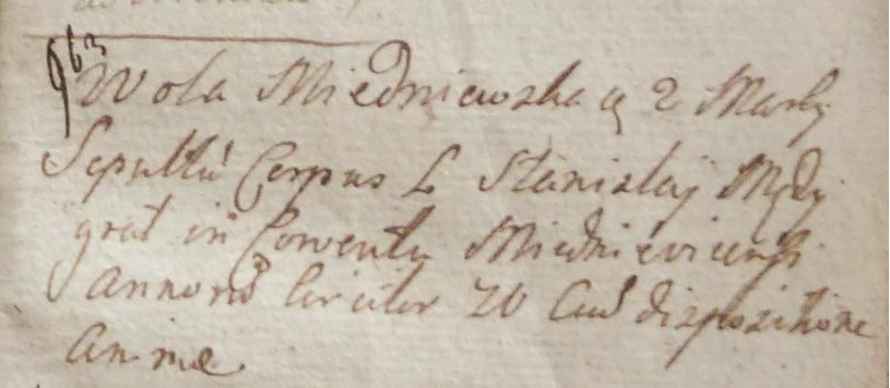 Ryc. 14. Akt zgonu kobietyo nazwisku Mędygrał, należącej do stanu chłopskiego, zmarłej w Woli Miedniewskiej w 1771 roku. W zapisie widoczne jest pozostawione miejsce na wpisanie jej imienia. Identyfikacja tej zmarłej jako jednej z żon „drugiego” Stanisława pozostaje jednak wyłącznie hipotezą (źródło: Metryki GenBaza).