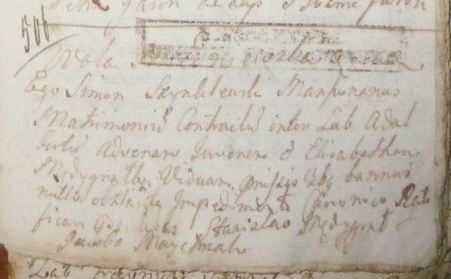 Pierwsza pewna wzmianka o Stanisławie Mędygrale pochodzi z aktu jego małżeństwa z Elżbietą, sporządzonego 20 listopada 1762 roku w Woli Miedniewskiej (Ryc. 8). Został w nim określony jako laboriosus, czyli „pracowity”, co w ówczesnej praktyce kancelaryjnej wskazuje na jego przynależność do stanu chłopskiego. Nazwisko panieńskie Elżbiety zapisano w akcie niestety w sposób nieczytelny. Być może chodzi o formę Baszczonka lub Barzczonka, którą można ostrożnie wiązać z nazwiskami występującymi w księgach metrykalnych z tego samego okresu, takimi jak: Barszczewicz, Barszczewski, Baszcz lub Baszczewski.