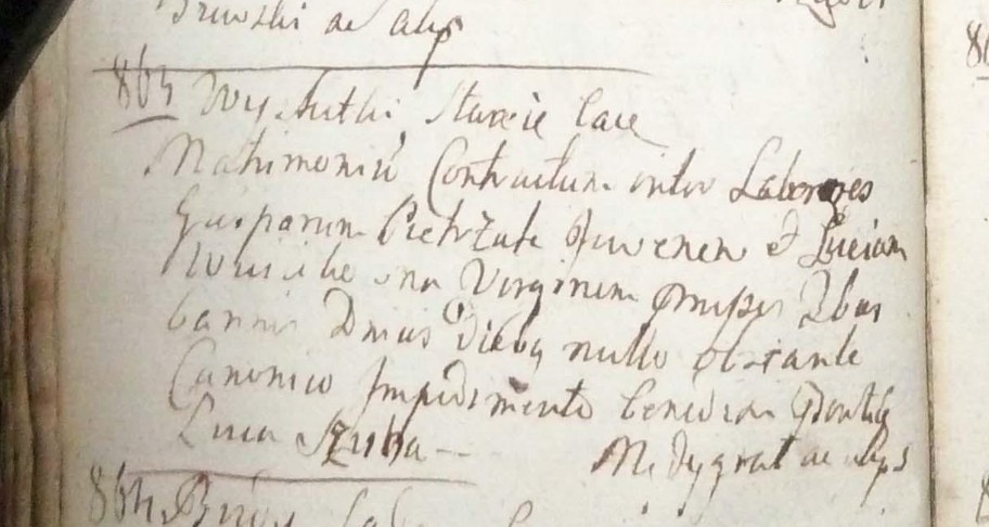 Ryc. 10. Akt ślubu Kacpra Mędygrała i Łucji Wójcik z 1792 roku. W akcie nazwisko pana młodego zapisano błędnie jako Pietrzak. Być może doszło tu do pomyłki związanej z jednym ze świadków, określonym jedynie jako Mędygrał (źródło: Metryki GenBaza).