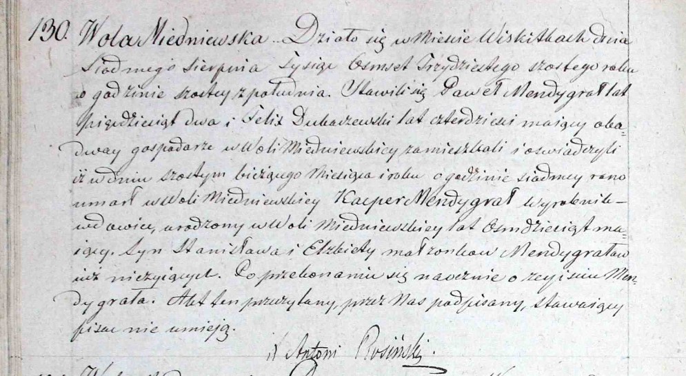Ryc. 7. Akt zgonu Stanisława Mędygrała z 1800 roku, stanowiący część archiwum parafialnego w Wiskitkach. Zapis określa go jako senex, czyli starca lub człowieka sędziwego, zmarłego w Woli Miedniewskiej w wieku około 100 lat, i informuje o pochówku na cmentarzu po stronie północnej, zapewne na terenie klasztoru w Miedniewicach (źródło: Metryki GenBaza).