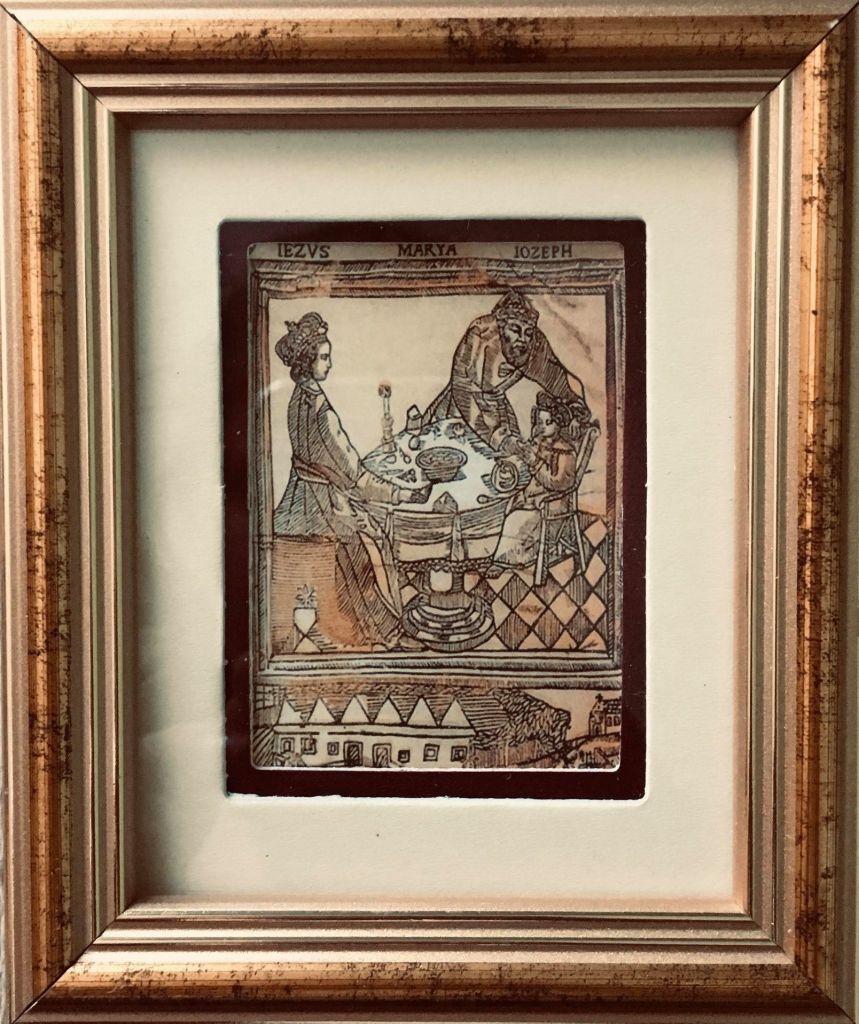 Ryc. 3. Drzeworyt 50×50 cm czczony w Miedniewicach, przedstawiający Świętą Rodzinę: Jezusa, Maryję i Józefa przy wspólnym stole (źródło: Radio Niepokalanów).