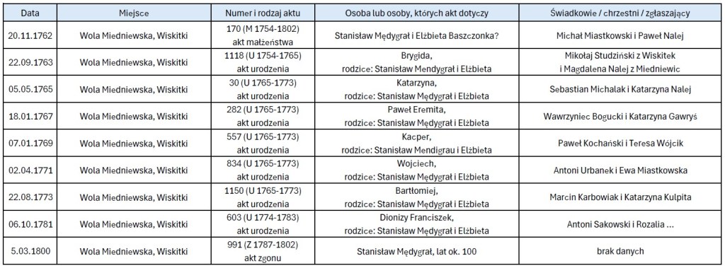 To właśnie w Wiskitkach przez pokolenia zapisywano chrzty, śluby i zgony mieszkańców Woli Miedniewskiej — również członków rodziny Mędygrałów. Dlatego z genealogicznego punktu widzenia Wiskitki okazały się miejscem najważniejszym: to tam zachowały się najstarsze księgi metrykalne, spisywane po łacinie, dzięki którym można dziś odtwarzać dzieje tej rodziny sprzed blisko 300 lat.