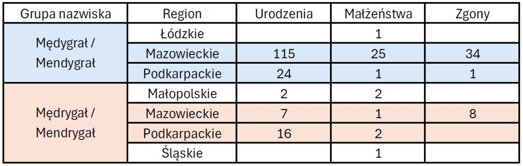 Co istotne, niektóre różnice widoczne we współczesnym rozmieszczeniu tych nazwisk nie wydają się zjawiskiem nowym. Potwierdza to również materiał pochodzący z dostępnych online baz akt metrykalnych z ziem polskich do 1825 roku, dostępnych na portalu Polskiego Towarzystwa Genealogicznego. Także on pokazuje wyraźne zróżnicowanie regionalne badanych form. W grupie Mędygrał / Medygrał / Mendygrał najwięcej poświadczeń pojawia się na obszarze dzisiejszego Mazowsza, przy wyraźnie słabszej obecności na Podkarpaciu oraz pojedynczym wpisie na terenie współczesnego województwa łódzkiego. Z kolei grupa Mędrygał / Mendrygał jest najsilniej zakorzeniona na Podkarpaciu, podczas gdy na Mazowszu poświadczona jest znacznie rzadziej, a w Małopolsce i na Śląsku występuje jedynie śladowo (Tab. 2).