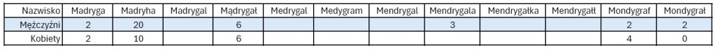 Tab. 3. Wykaz znanych i rzadszych wariantów nazwiska Mędygrał lub Mędrygał. Dane liczbowe dotyczą osób żyjących występujących w rejestrze PESEL (stan na 20.01.2026). Nazwiska z pojedynczą liczbą wystąpień oraz dane dotyczące osób zmarłych nie zostały uwzględnione w zestawieniu (źródło: Otwarte Dane).