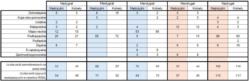 Tab. 1. Wykaz najczęstszych wariantów męskich i żeńskich nazwisk Mędygrał lub Mędrygał występujących w rejestrze PESEL według województwa zameldowania na pobyt stały (stan na 20.01.2026). Nazwiska z pojedynczą liczbą wystąpień oraz dane dotyczące osób zmarłych nie zostały uwzględnione w zestawieniu (źródło: Otwarte Dane).
