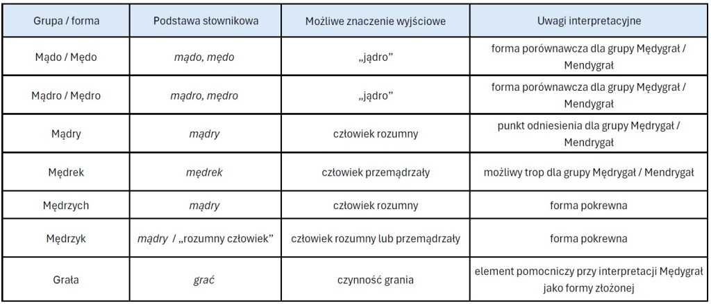 Warto dodać, że oprócz pięciu podstawowych form — Mędygrał / Medygrał / Mendygrał oraz Mędrygał / Mendrygał — spotyka się również warianty rzadsze (Tab. 3). Nie wszystkie należy jednak traktować jako równorzędne historyczne postaci tego samego nazwiska. Część z nich można wyjaśniać lokalną wymową, niestabilną ortografią dawnych zapisów albo przystosowaniem do pisowni pozbawionej polskich znaków diakrytycznych.