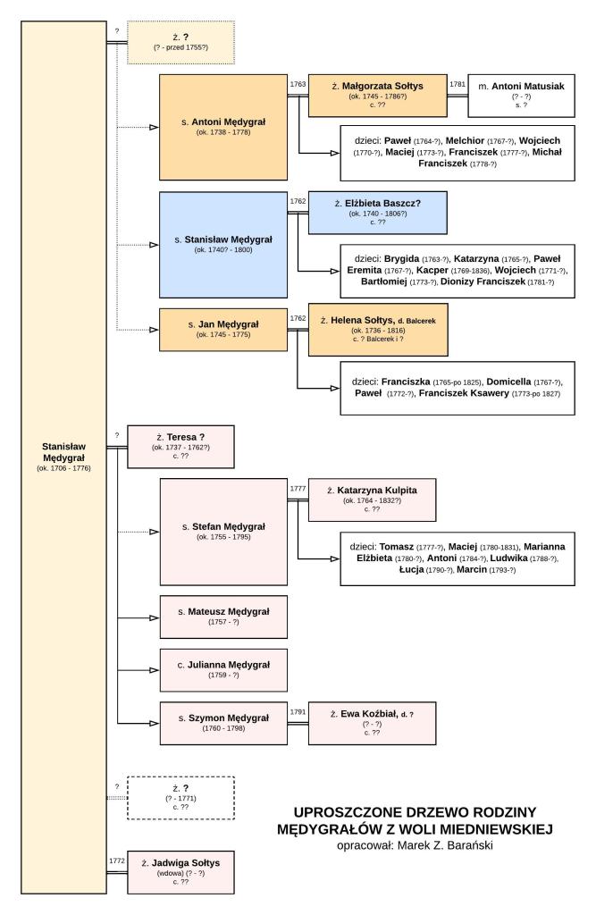 Na obecnym etapie badań pozostaje to jednak jedynie hipotezą roboczą. Brakuje źródeł, które pozwoliłyby ją bezpośrednio potwierdzić. Najbezpieczniej przyjąć, że w drugiej połowie XVIII wieku w Woli Miedniewskiej żyły co najmniej dwie dorosłe osoby o imieniu Stanisław Mędygrał, należące zapewne do tego samego szerszego rodu, ale reprezentujące odrębne gospodarstwa i prawdopodobnie odrębne gałęzie rodzinne.